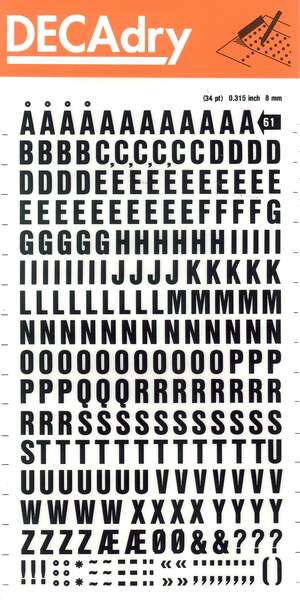 Letras de palo mayúsculas adhesivas de altura 8 mm (34 pt) en color negro.