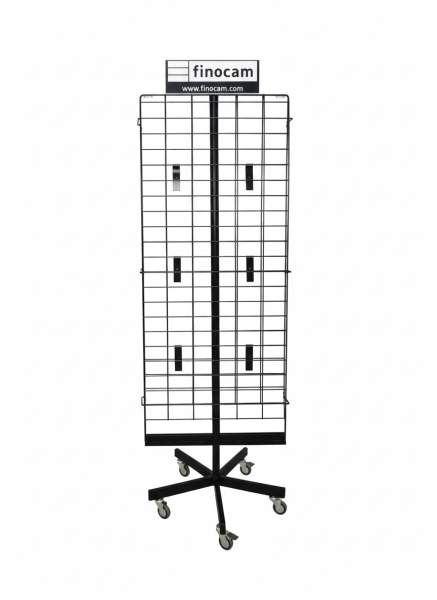 Expositor vacío de pie metálico giratorio de la marca Finocam, diseñado para la exhibición ordenada de calendarios en puntos de venta. Cuenta con una estructura robusta y estable, equipado con cinco ruedas que facilitan su movilidad y manejo. Su diseño permite una rotación suave, optimizando la visibilidad y accesibilidad de los productos. Ideal para organizar y presentar calendarios de manera eficiente y atractiva en cualquier espacio comercial.