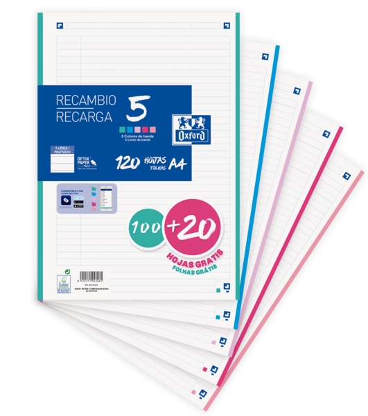 Oxford School Recambio 120 Hojas A4 1 Linea – 4 Taladros – 5 Bandas de Color