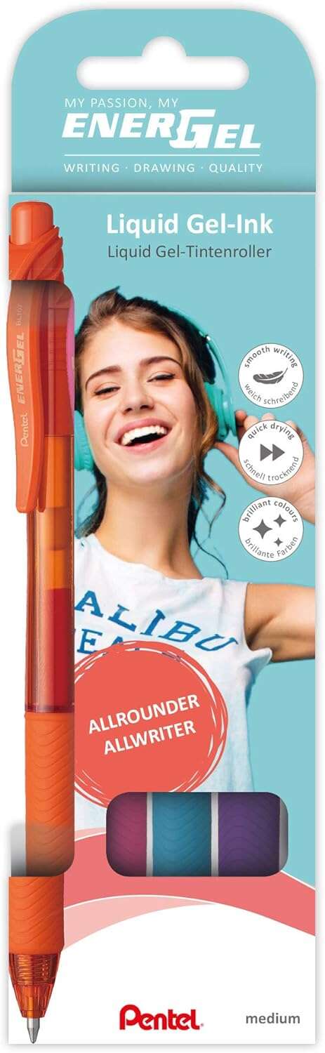 Bolígrafo de gel con cuerpo de plástico semitransparente con zona de agarre recubierta de goma para un buen agarre. Tinta Pentel EnerGel original para una escritura suave y fluida. Se seca particularmente rápido, recomendado tanto para los que escriben mucho como para los zurdos