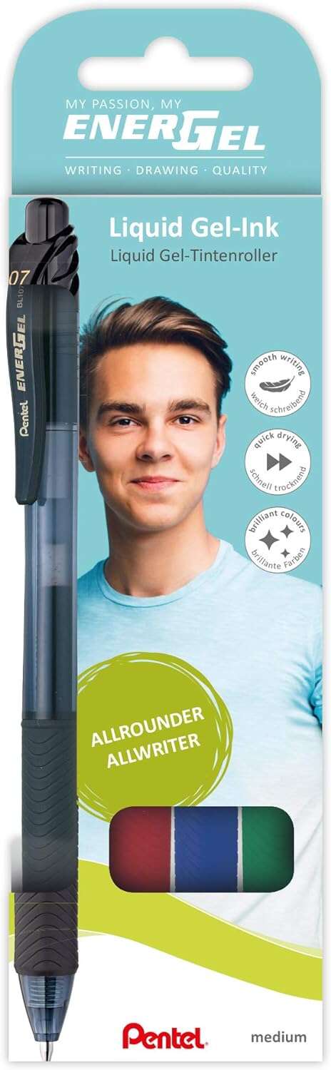 Bolígrafo de gel con cuerpo de plástico semitransparente con zona de agarre recubierta de goma para un buen agarre. Tinta Pentel EnerGel original para una escritura suave y fluida. Se seca particularmente rápido, recomendado tanto para los que escriben mucho como para los zurdos