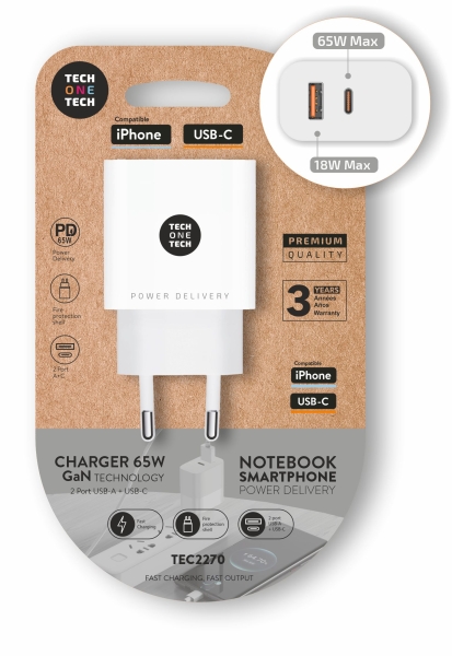 TechOneTech Cargador de Pared PD 65W con 1 Puerto USB-C + 1 Puerto USB-A